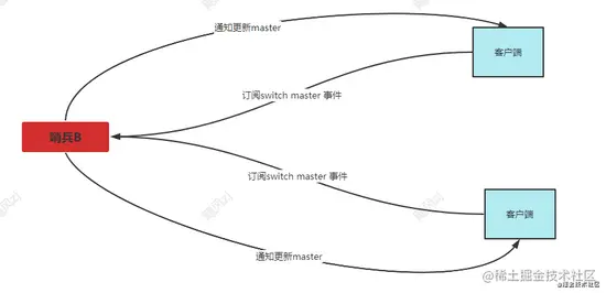 哨兵B Leader 可以主持主从切换了,通知其他从库执行replicaof 到新的Master,主从切换完成之后,还会通知连接redis 的客户端,告诉它们新的Master的地址和端口。