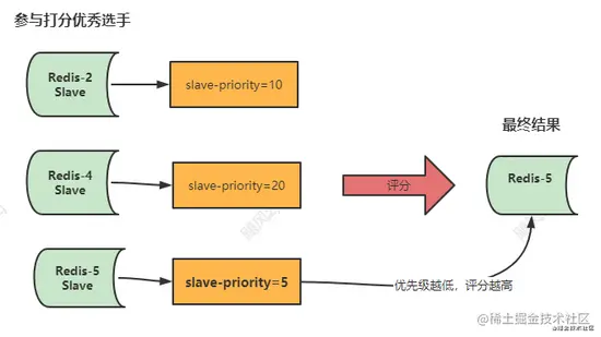 你可以手动设置从库的优先级,通过 slave-priority 进行设置,数字越小,级别越高。如果这个层次,有优先级级别最高的出现,那么就选此从库做为Master,选举就结束了,如果优先级相同,那么进入下一轮打分。 看图: