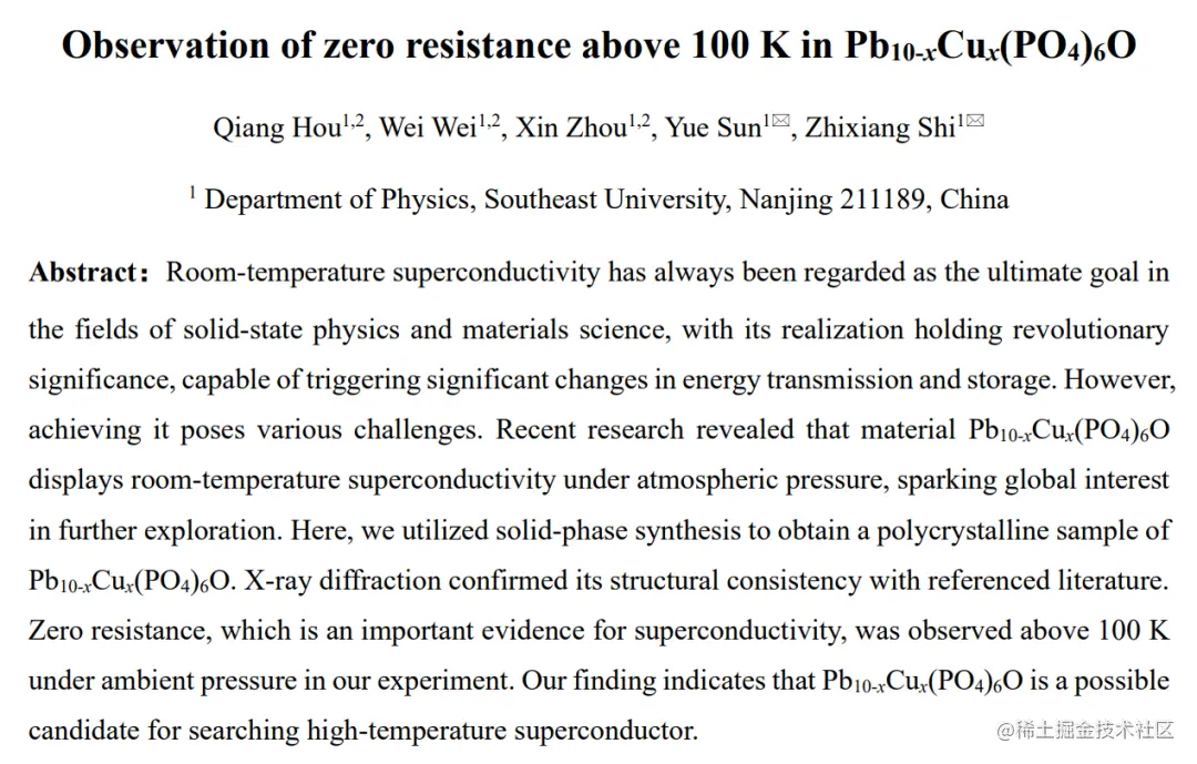 目前,这篇论文已经提交至了预印本网站 arXiv。作者来自东南大学物理学院超导研究团队,由三名学生侯强、魏伟、周鑫以及孙悦教授、施智祥教授共同完成。