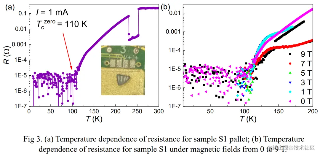 从图 3(a)的结果来看,样品在高温下表现出一点点半导体行为,但随着温度的不断降低,在 110K 温度左右电阻基本上降到了 0。这时电阻的数值大约在 10^-5 到 10^-6 Ω,电流是 1mA,因而电压值在 10^-8 或 10^-9 V,达到了测量用仪器 PPMS 的极限。基于此,该团队认为观测到了零电阻。