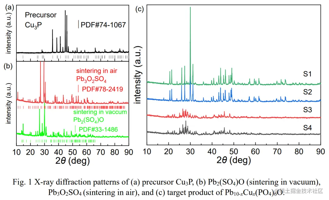 这一次是如何验证的?孙悦在参与撰写的相关论文中进行了详细介绍。首先来看下图 1 的 X 射线衍射结果,图 1(a)和(b)是两种前驱物的 XRD 结果,图 1(c)是四个样品的 X 射线结果。