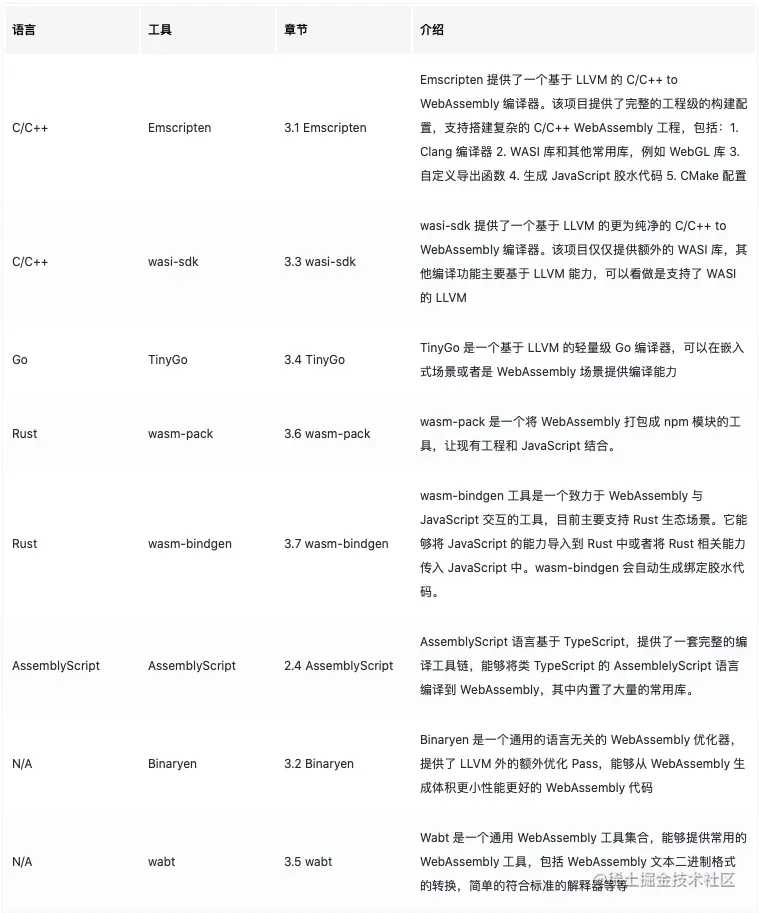 综上所述,wasm 作为一个拥有上述四大特点的二进制中间产物,那么不同的开发者都可以很好的应用。比如对 js 开发者来说,为了享受高性能,则可以使用 rust/assemblyScript 生成 wasm 来实现;而 c/c++/rust 开发者也可以利用自身语言优势生成 wasm 提供给 js 开发者使用或者在 web 使用。