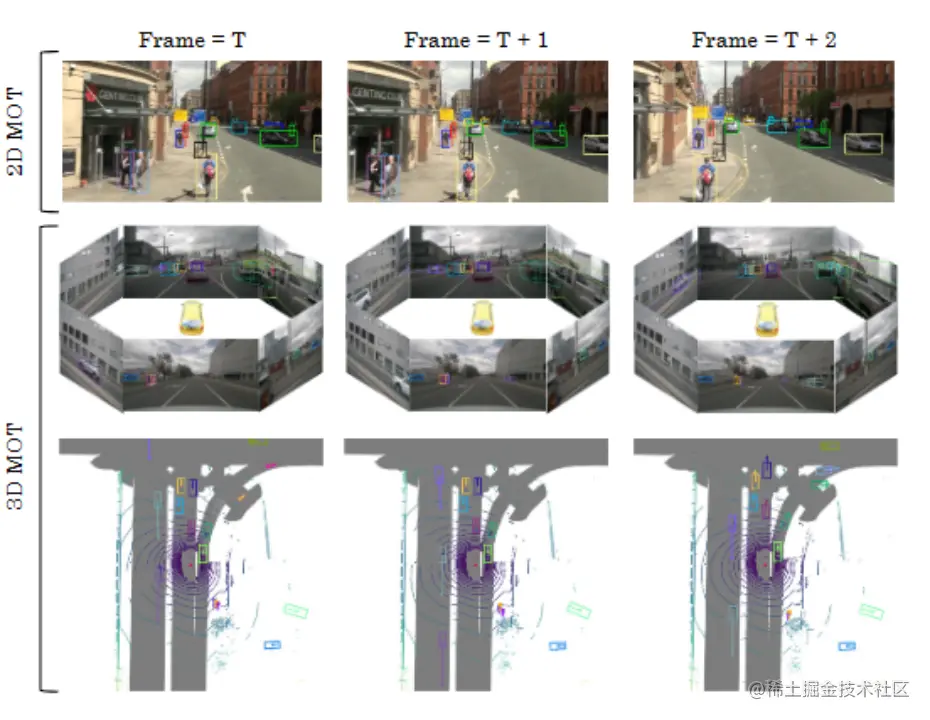 二维多目标跟踪和三维多目标跟踪本质上是一样的。这两个任务都要定位对象,并获得对象在不同帧之间对应关系。但是,它们通常由不同领域的研究人员独立解决,因为输入数据来自不同的模式。二维MOT基于图像平面,图像信息在对象对应中起着基本作用。基于外观的跟踪器从图像中提取对象外观特征,然后计算特征距离作为对应关系。三维MOT通常在世界坐标系统中执行。更容易通过空间相似性区分不同对象,如三维IoU或点距离。下图显示了二维MOT和三维MOT的可视化结果。