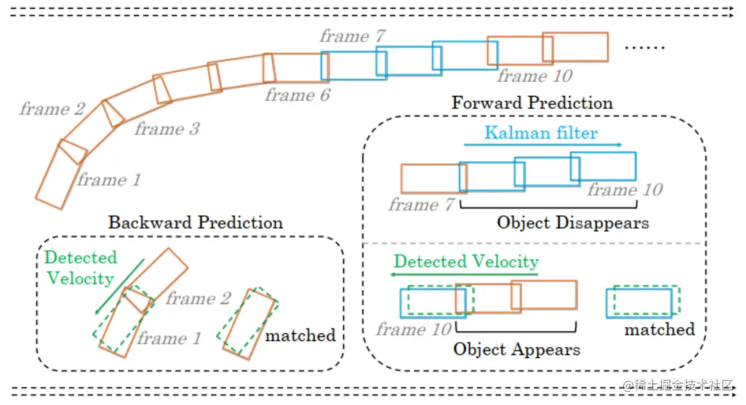我们提出了一个互补的三维运动预测策略,以解决驾驶场景中的目标突变运动和短期消失问题。具体来说,我们采用检测到的速度进行短期关联,采用卡尔曼滤波器进行长期关联。在三维场景中,现代检测器有能力通过时间建模预测准确的短期速度。卡尔曼滤波器通过基于历史信息的状态更新对长期速度建模。我们通过双向预测策略最大化两种运动模型的优势。我们采用卡尔曼滤波器进行前向预测,采用检测器预测的对象速度进行后向预测。后向预测负责活跃轨迹的短期关联,而前向预测在对象丢失后重新出现时进行长期关联。图4说明了互补运动预测策略。