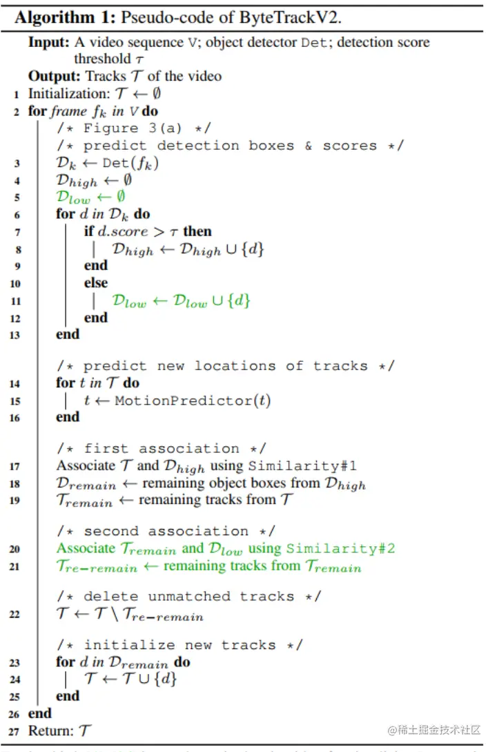 概述。在视频的第一帧中,我们将所有高分检测框初始化为轨迹。在后续帧中,我们首先将高分检测框与所有轨迹(包括丢失的轨迹)相关联。一些轨迹由于不匹配适当的高分检测框而未匹配,这通常发生在遮挡、运动模糊或尺寸变化时。然后,我们将低分检测框和这些未匹配的轨迹关联起来,同时恢复低分检测框中的对象并过滤背景。算法1展示了ByteTrackV2的伪代码。