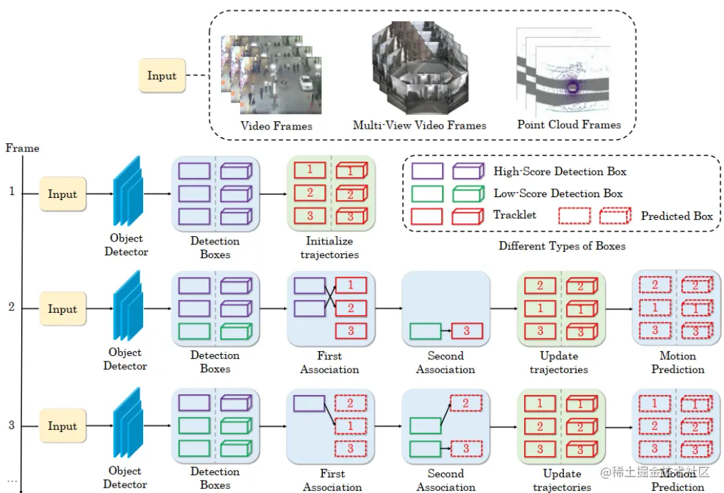 本文利用三个模块解决二维和三维MOT任务,分别是检测、运动预测和数据关联。首先,对象检测器生成二维/三维检测框和分数。在开始帧中,检测到的对象被初始化为轨迹。然后,卡尔曼滤波器等运动预测器预测以下一帧中轨迹的位置。运动预测在图像平面和三维空间都容易实现。最后,根据一些空间相似性,检测框与轨迹的预测位置相关联。检测是整个MOT框架的基础。由于视频中的复杂场景,检测器容易产生不完美的预测。高分数的检测框通常包含更多真阳性,而低分数的检测框则不然。但是,简单地消除所有低分数框是次优的,因为低分数检测框有时也会指示对象的存在,例如被遮挡的对象。滤除这些对象会对MOT造成不可逆转的错误,导致明显的丢失检测和破碎轨迹,如下图b所示。