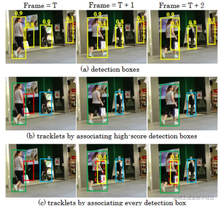 检测框。对于视频中的每个帧, 我们使用检测器预测检测框和分数。我们根据检 测得分阈值 将所有检测框分为两部分。对于分数高的检测框, 我们将它们放入高分检测框 。对于分数低的检测框, 我们将它们放入低分检测框 。