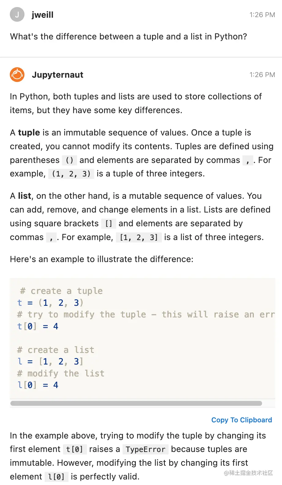 接下来,用户向 Jupyternaut 询问了一个问题:如「在 Python 中,元组和列表有什么区别?」Jupyternaut 给出了这两者的关键区别,并且回答的非常正确,最后还贴心的举了示例:
