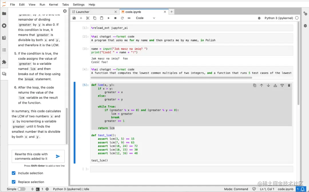 重写代码后,Jupyternaut 会将代码重新发送回用户选择的语言模型进行替换:
