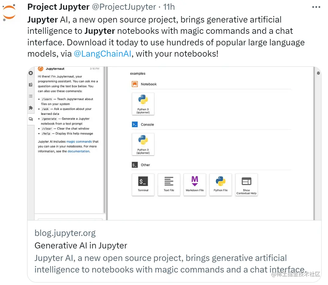 这主要归功于一个名叫 Jupyter AI 的项目,它是官方支持的 Project Jupyter 子项目。目前该项目已经完全开源,其连接的模型主要来自 AI21、Anthropic、AWS、Cohere、OpenAI 等各大明星公司和机构。