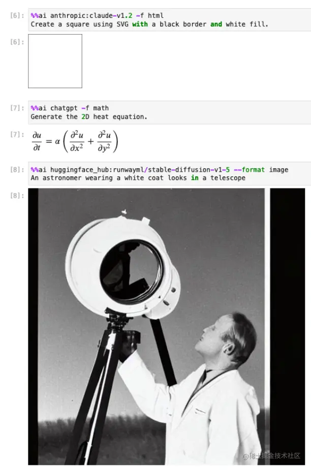 Jupyter AI 还提供了可以在 notebook cells 和 IPython 命令行界面中运行的 %% ai 命令,每个 %% ai 命令都需要一个模型,通常指定为 provider‑id:model‑id: