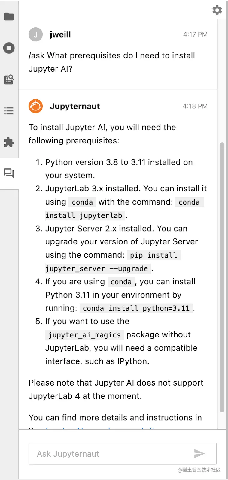 一旦 Jupyternaut 学习完成,你就可以使用「/ask」命令提出问题: