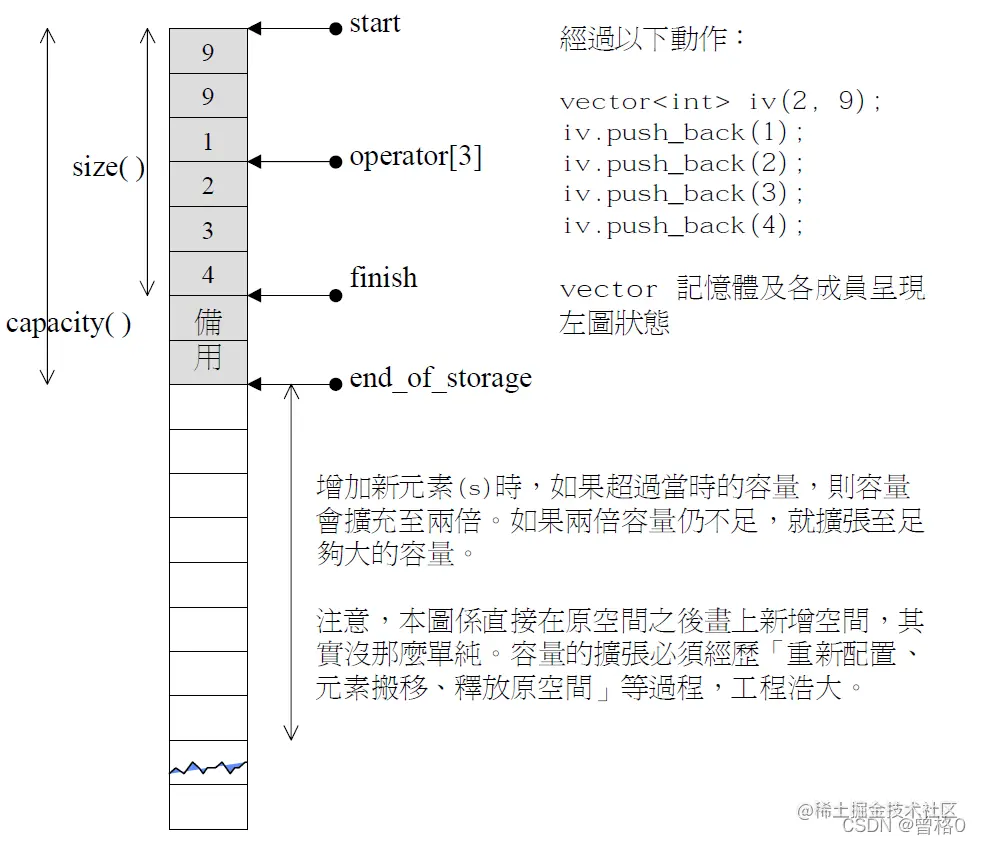 vector有点类似array,但vector是可以扩展的,但vector在扩展时,需要经历以下三个步骤:配置新空间=》移动数据=》释放旧空间,因此,如果vector空间配置策略不佳,则可能造成较大的空间成本损失。