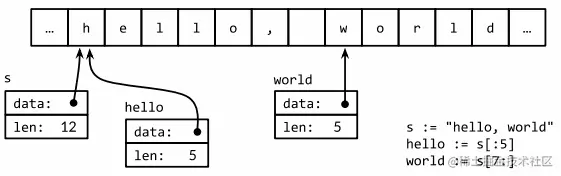 字符串切片区间:左闭右开。切片与原字符串共享内存