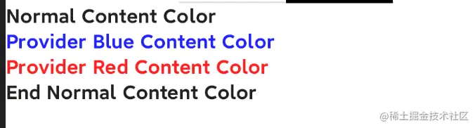 这里我们用三个Text来展示初始颜色值和提供局部颜色之后的区别,通过CompositionLocalProvider方法来提供局部的值改变,它接收两个参数,分别为value和content,value就是我们提供的颜色值,然后在content中组件的颜色就会获取到我们提供的颜色。