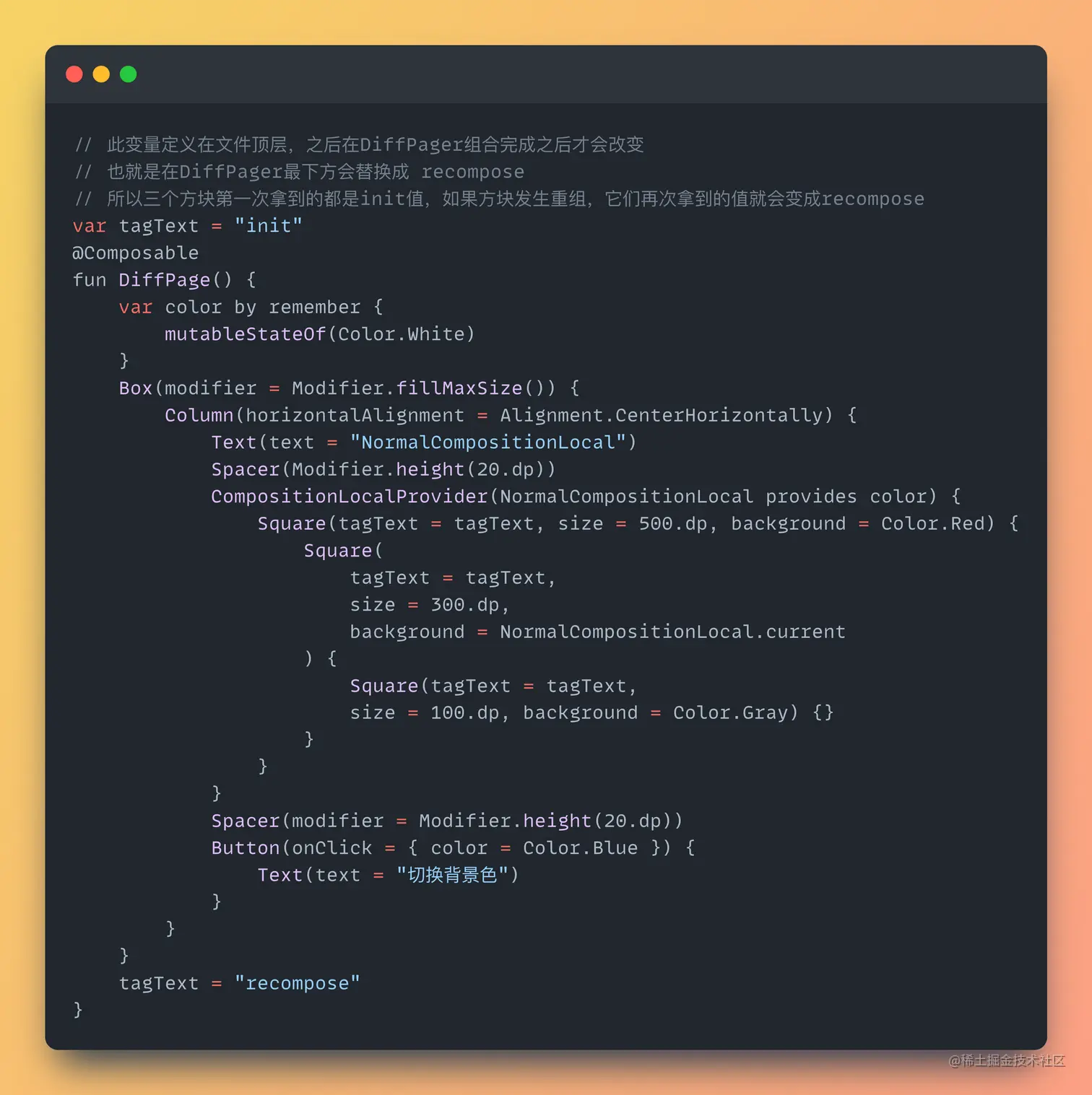 通过上面两个GIF可以看出,在compositionLocalOf的方式下,之后中间方块发生了重组,上方的文字从init变成了recompose,而staticCompositionLocal的方式,所有方块都发生了重组,方块的上方文字都发生了变化,这个例子就可以直观的表现出二者对于重组的不同之处。