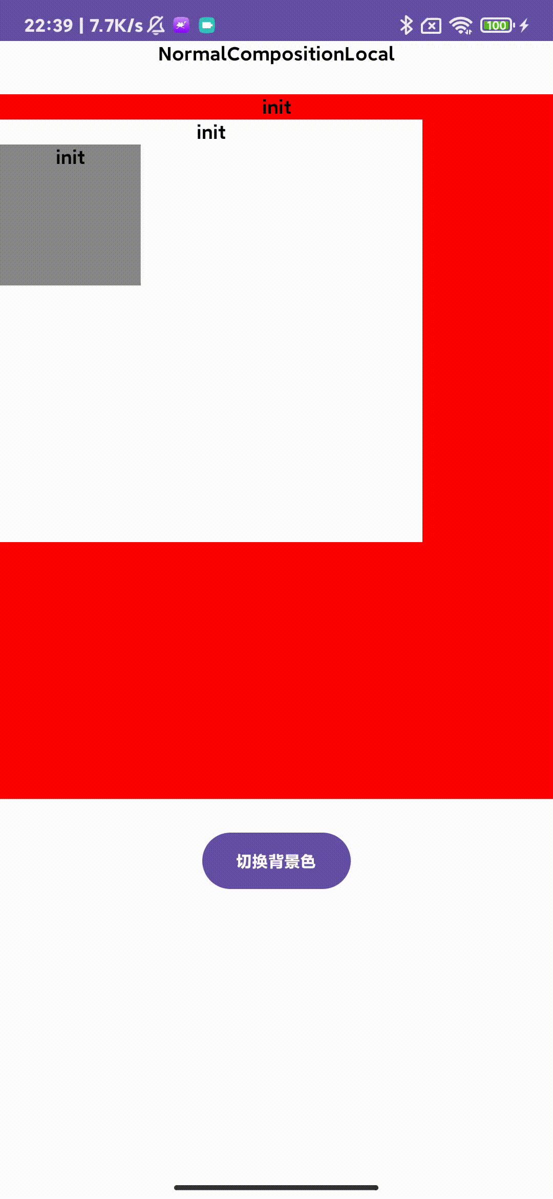 然后定义三个方块,中间那个方块的背景颜色引用CompositionLocal对应的颜色值,每个方块正上方添加一个文本,此文本的文字初始一致,但是在界面组合完成之后更改,再更改CompositionLocal值之后,观察三个颜色和上方文本是否有变化