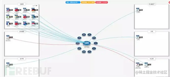 如下图所示,生产区的可信资产被外部互联网通过VPN协议被动连接,同时此资产主动连入办公网区,这就触发了“网络访问关系标准”,睿眼攻击溯源系统以红色标识进行告警:
