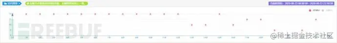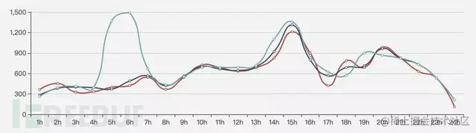一个攻击链路产生的流量,往往和正常交互的流量有所区别。如果一套业务系统主体功能业务流量的行为平时有迹可循,当回溯某攻击者时,对一段时间的数据进行自动对比后,会发现某天的数据差别特别突出。如下图所示,通过睿眼攻击溯源系统将这2天的数据与红色“基线”对比,绿色线条的差异显而易见:
