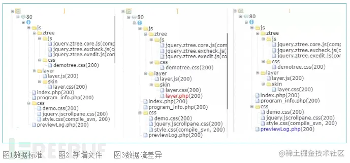 如下图左侧图1所示,在前期对当前网站正规文件结构体和双向数据流做数据标准处理,以备随时与后期流量进行对比;如下图中间图2所示,某时间段与图1对比后,发现新增未知可疑文件(红色标识),需要进一步排查文件的可疑性;如下图右侧图3所示,某时间段与图1对比后,发现已知文件(蓝色标识)双向数据与标准数据流反差巨大,则需核实此文件是否被植入特殊代码。