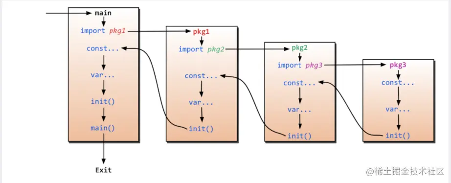下面是一个示例,展示了两个包的init函数的调用顺序: