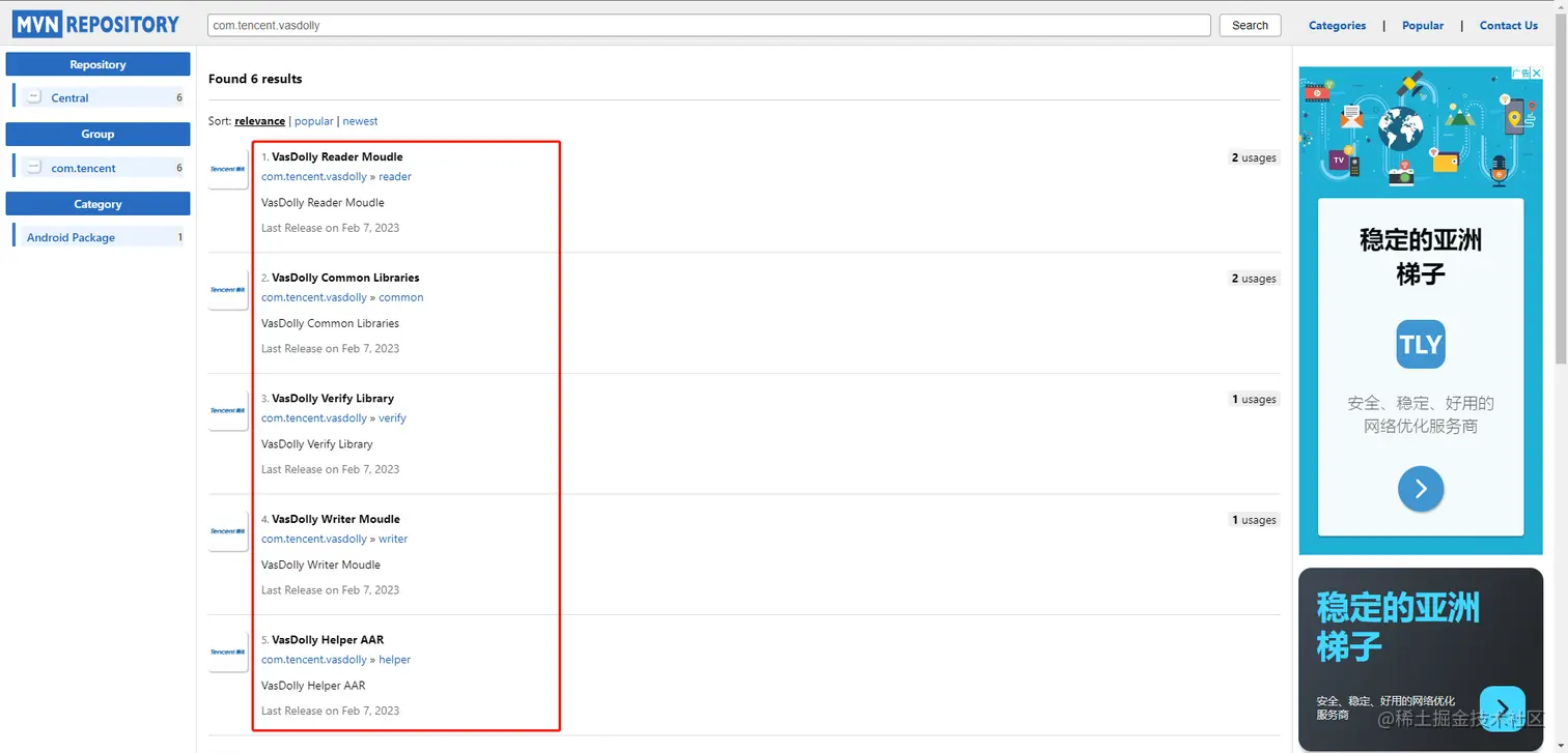 于是我在 maven 中央仓库搜索了 com.tencent.vasdolly 关键字后,有了如下发现,