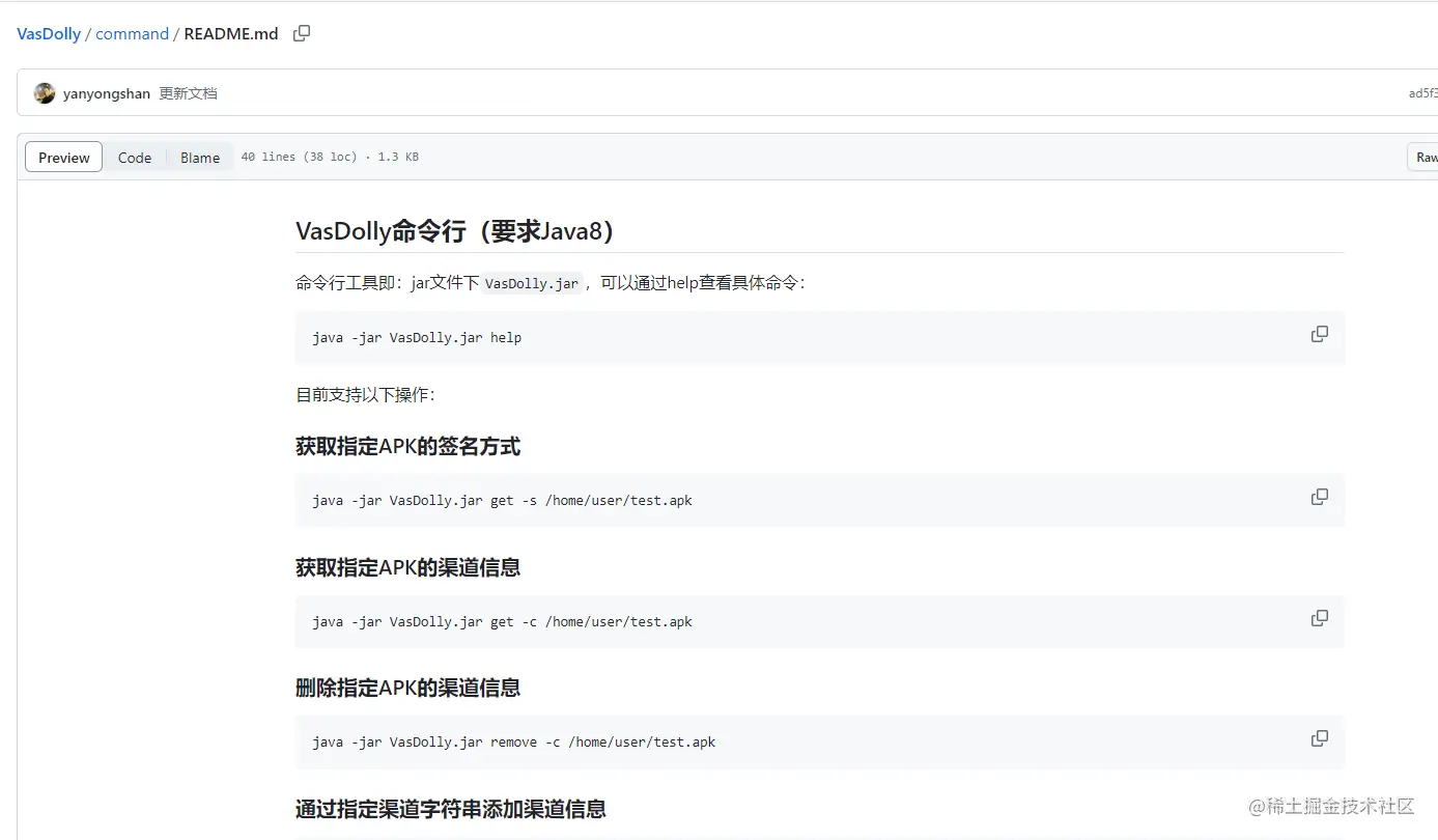 VasDolly 官方对于 VasDolly 的定位是安卓端多渠道打包工具,由安卓开发接入安卓项目中使用。VasDolly 官方还提供了 jar 包工具通过命令行方式进行打包操作。