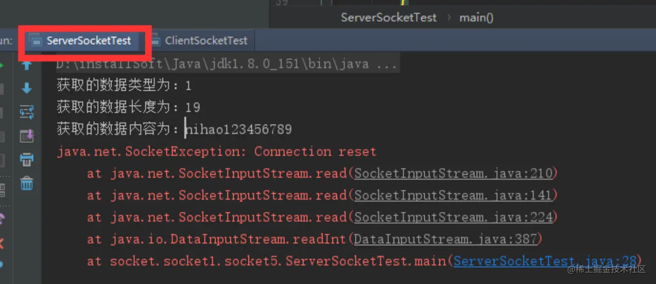 上面服务端分别接受到数据的类型,长度和详细内容,具体下面的错误异常是由于客户端发送一次后关闭,服务端任在接受数据,就会出现连接重置的错误,这是一个简单的通过数据类型+数据长度+数据内容的方法发送数据的一个小例子,让大家了解socket通信数据发送的原理,在实际应用中,原理不出其左右,只是在业务逻辑上完善而已。