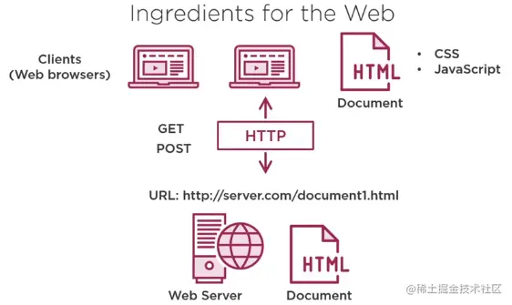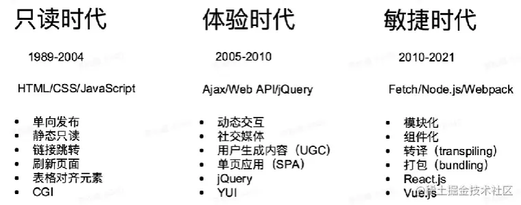 Web 诞生于 1989年,主要有三种技术构成:HTML、HTTP(超文本传输协议)、URL,后几年出现 CSS 和 JavaScript。