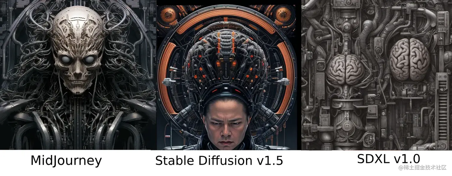 评论:MidJourney 和 SDXL 都产生了符合提示的结果。SDXL 更好地再现了艺术风格,而 MidJourney 更注重制作美观的图像而不是再现艺术风格,它也丢失了许多提示细节(例如:图像没有显示为机器提供动力的大脑,而是显示了为机器提供动力的头骨)。