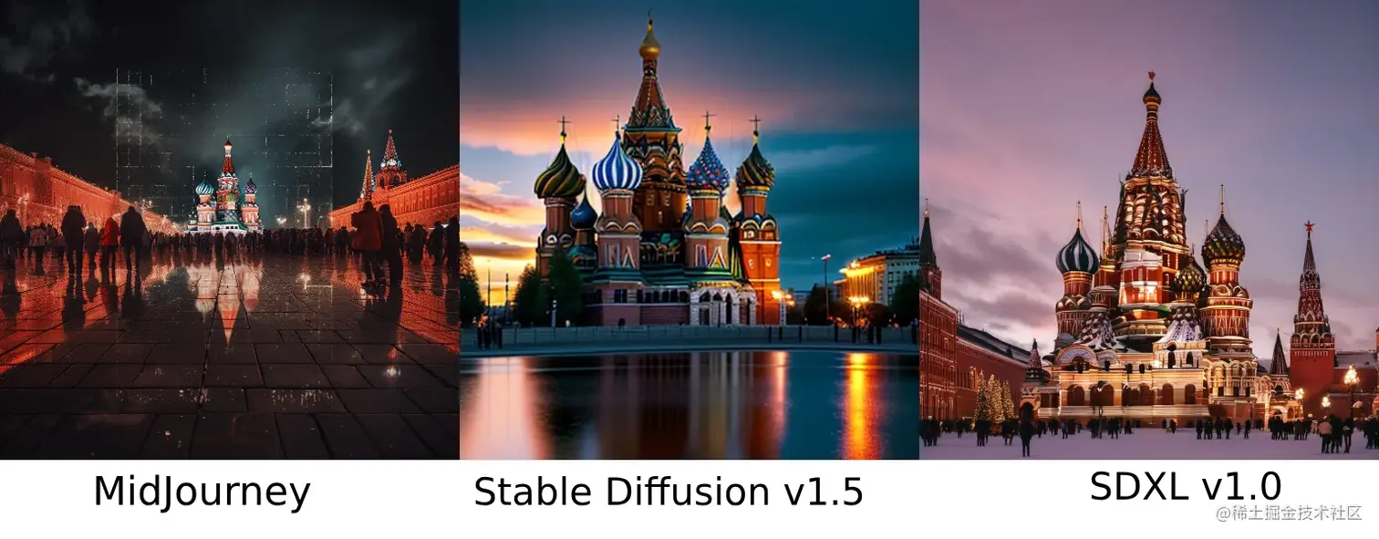 点评:MidJourney 试图在打造一个远景的城堡,SDXL v1.0 更清晰,但 SD v.15 的颜色对比度更好。