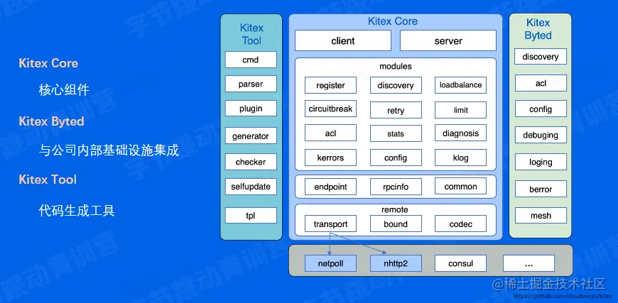 右边绿色的byted是对字节内部的扩展,集成了内部的二方库还有与字节相关的非通用的实现,在第二节高级特性中关于如何扩展kitex里有介绍过,byted部分是在生成代码中初始化client和server时通过suite集成进来的,这样实现的好处是与字节的内部特性解耦,方便后续开源拆分。