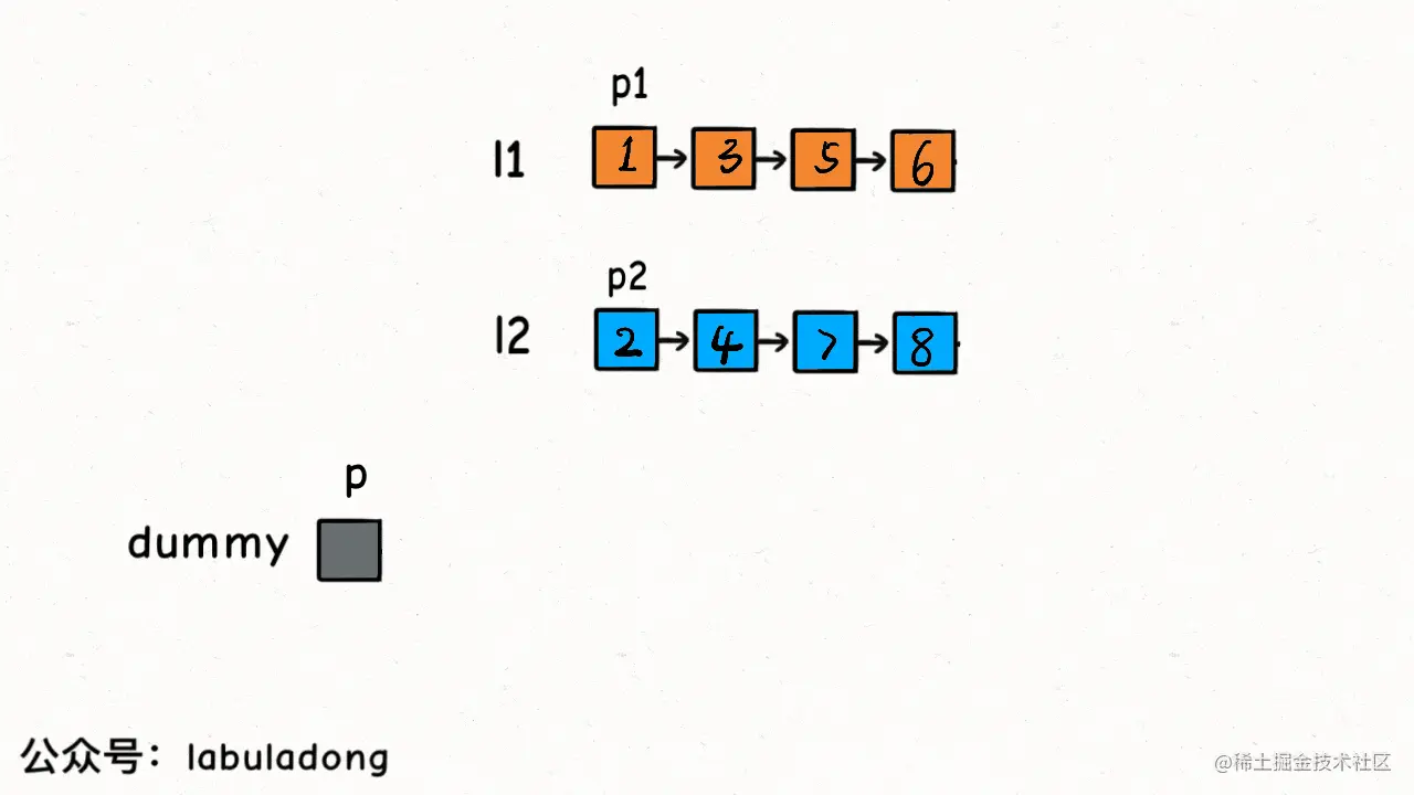 dammy。这样,在操作结束后,我们可以直接通过dammy.next来获取合并后的链表的头部。 - p 是一个工作指针,它表示我们当前正在操作的位置。当我们决定将