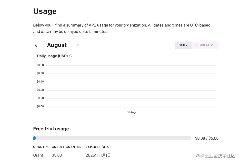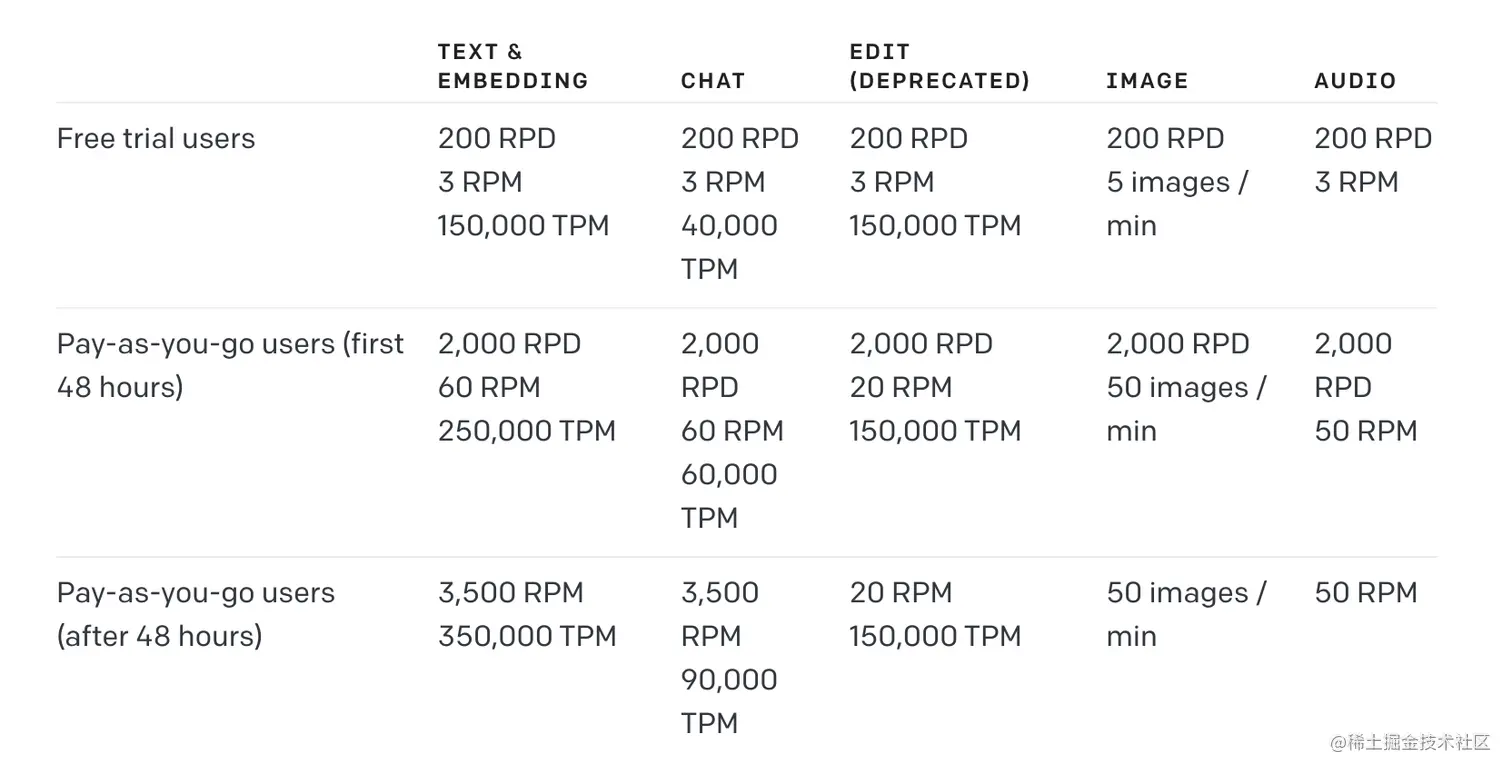 从表格中可以看出,免费试用用户(新注册账号会有5美元调用额度)和按需付费用户的默认速率限制是不一样的。