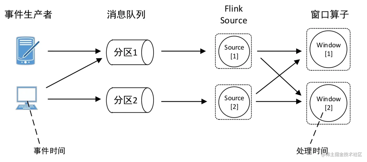 例如,一个用户在10:00使用APP下了一笔订单,系统产生了一条日志并记录日志的产生时间为10:00。接下来这条数据被发送到Kafka,然后使用Flink进行处理,当数据到达Flink时,Flink的系统时间为10:02。10:02指的是处理时间,而10:00则是事件时间。如果想要准确的获得这个APP每分钟生成的事件数量,那么可能需要使用数据生成的时间(嵌入数据中的事件时间),而不是Flink的处理时间。