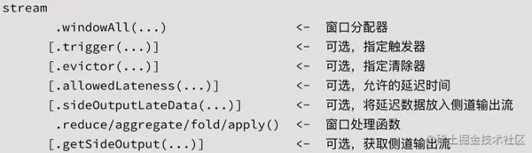 全量计算:需要依赖窗口中的所有数据或需要获取窗口中的状态数据和窗口元数据(窗口开始时间、窗口结束时间等)。例如对整个窗口数据排序取TopN,比如ProcessWindowFunction。