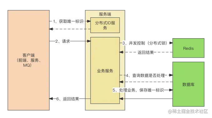 并发控制(分布式锁): 服务端收到请求后,根据标识判断是否为重复请求。同时,记录已处理的请求标识。