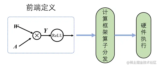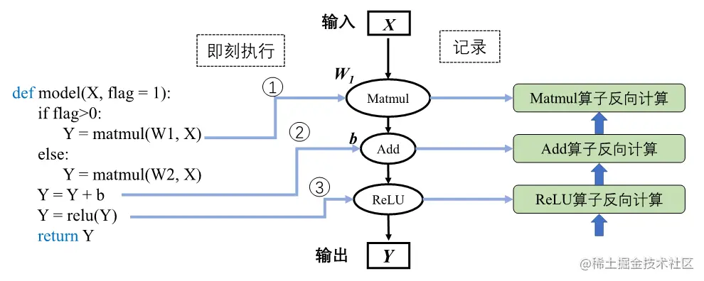 前向计算 matmul(w1, x) 的时候,会记录下来反向计算过程是 grad_w1 = grad_y * x,记录下需要参与反向计算的算子和张量 x,mlsys 依据收集的信息完成前向计算和反向图构建。