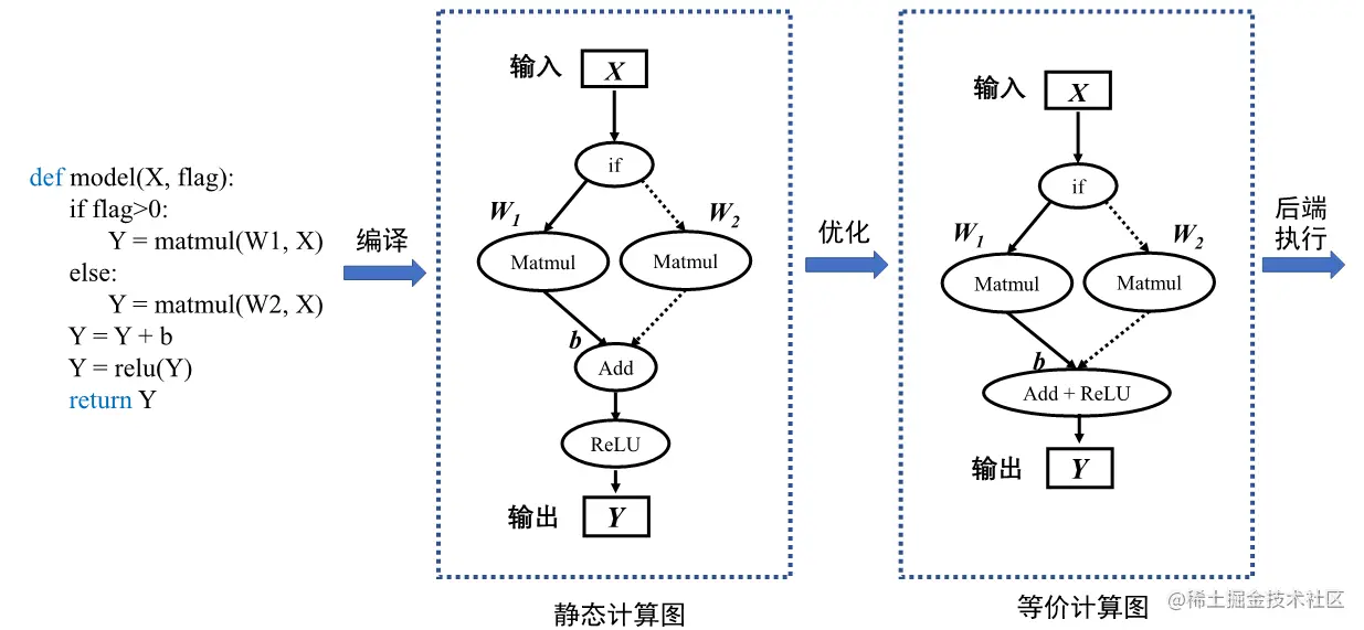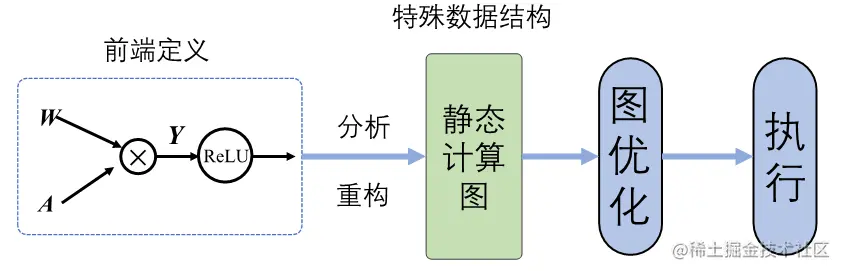 使用前端语言(Python)定义模型形成完整的程序表达后,mlsys 首先对模型进行分析,获取网络层之间的拓扑关系(有哪些 op、每个 op 的输入输出结构、op 之间的计算顺序)还有参数变量设置、损失函数等信息。然后 mlsys 会将完整的模型描述编译为可被计算后端调用执行的固定代码文本(或者叫 IR,intermediate representation 中间表示),这种有模型完整拓扑关系的计算图就是静态图。静态计算图直接接收数据并通过相应硬件调度执行图中的算子来完成任务。静态计算图可以通过优化策略转换成等价的更加高效的结构,提高后端硬件的计算效率(也就是对 IR 做一些优化)。