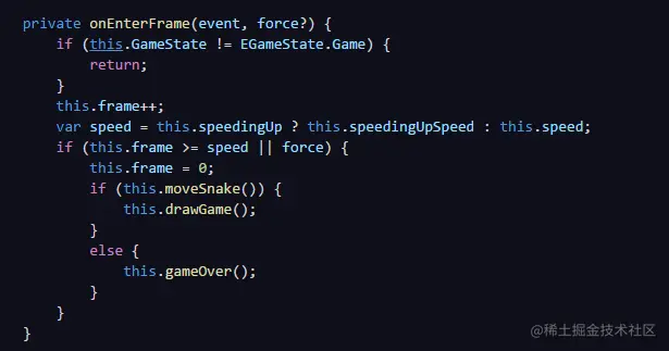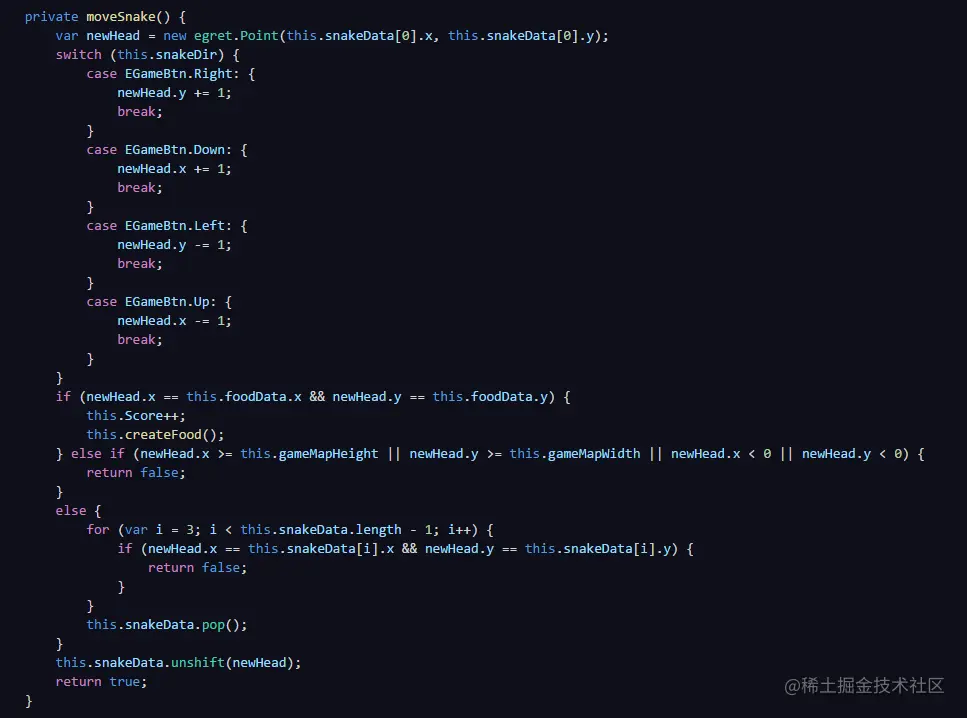 1.小蛇移动的大概逻辑:首先获取小蛇的头部,然后根据小蛇的方向得出小蛇头部下一个移动到达的点,把该点插入小蛇的头部(链表的顶端),然后把小蛇尾部的节点移除来形成一个向前移动的过程。吃食物的情况就是下一个移动到达的点是食物,直接把该点加入到小蛇的头部,但不需要从尾部移除节点。然后重新产生新的食物。