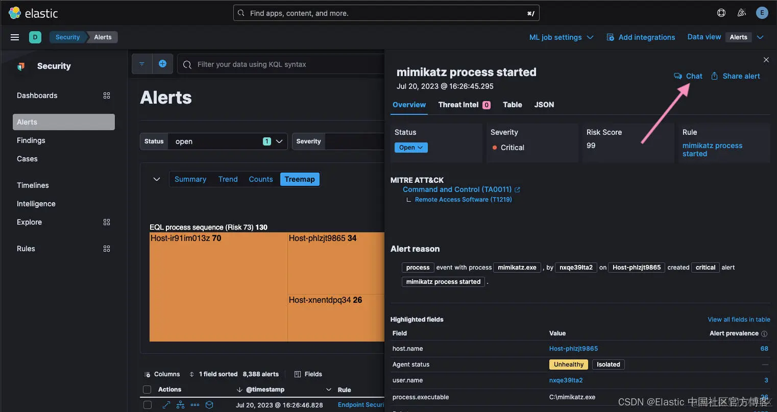 在整个 Elastic Security 中单击 “Chat” 按钮会将数据(例如下面屏幕截图中的示例警报)作为聊天的上下文: