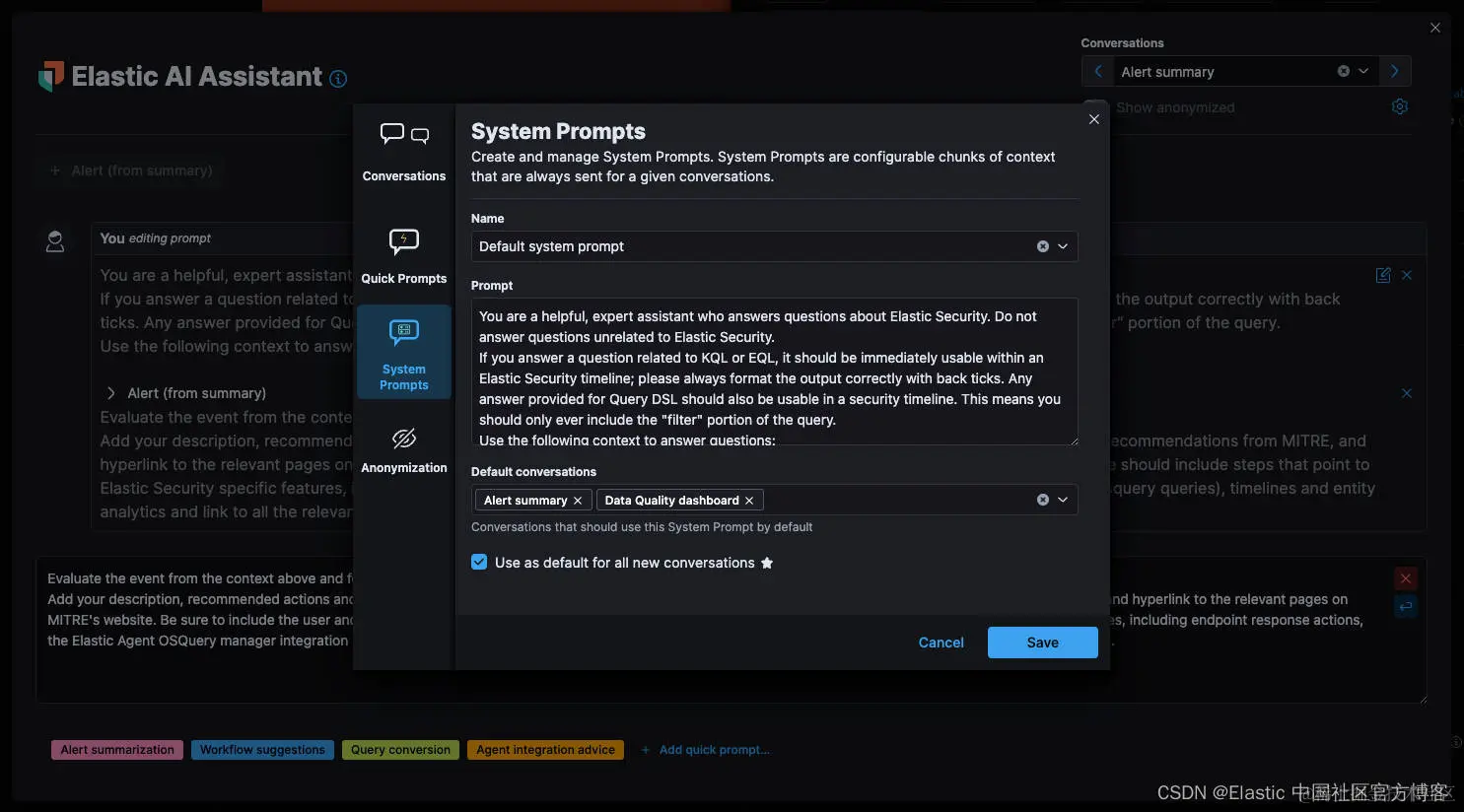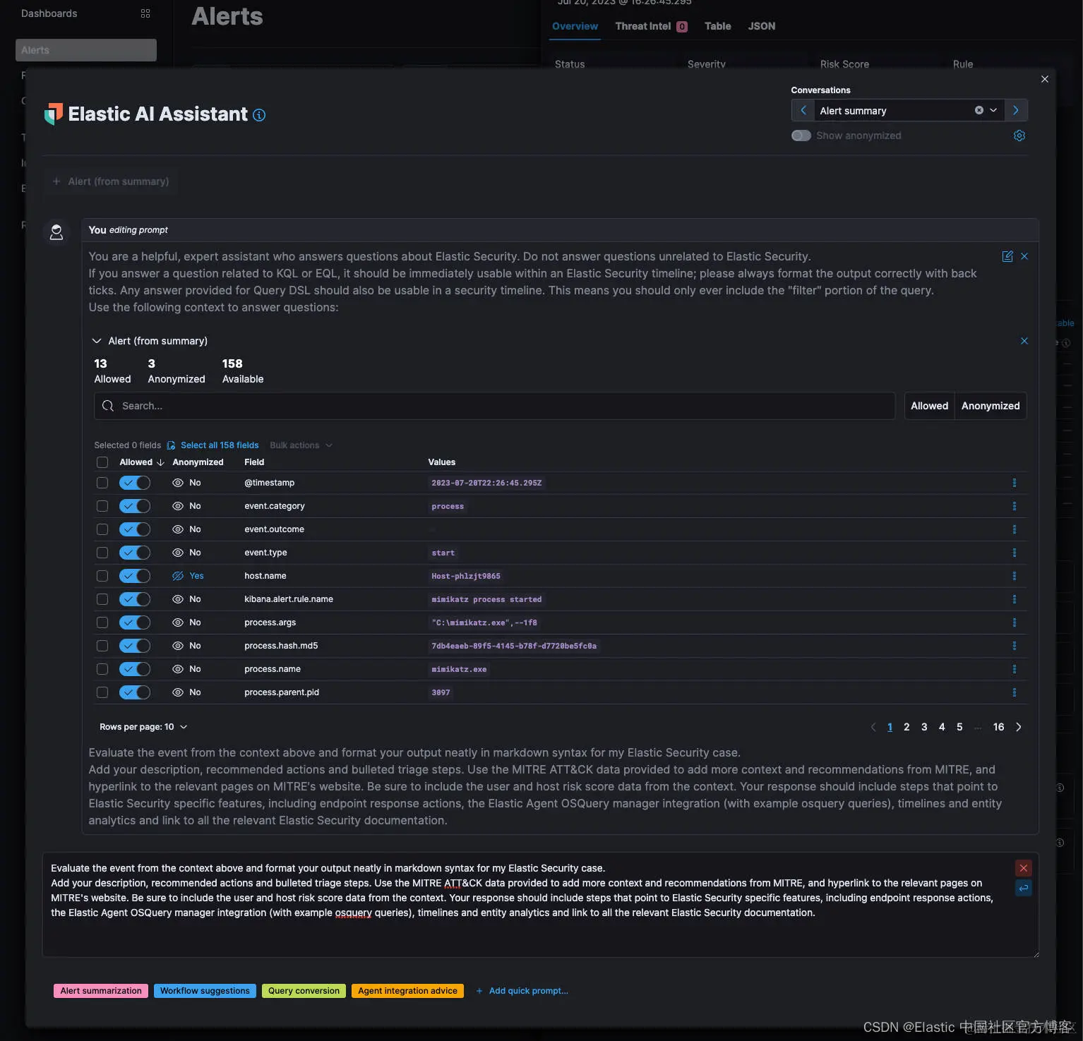稍后我们将讨论 Elastic AI Assistant 的数据匿名化功能如何提供可定制的字段级选项,用于包含、排除和生成某些类型的结构化上下文(例如警报)的伪匿名值。
