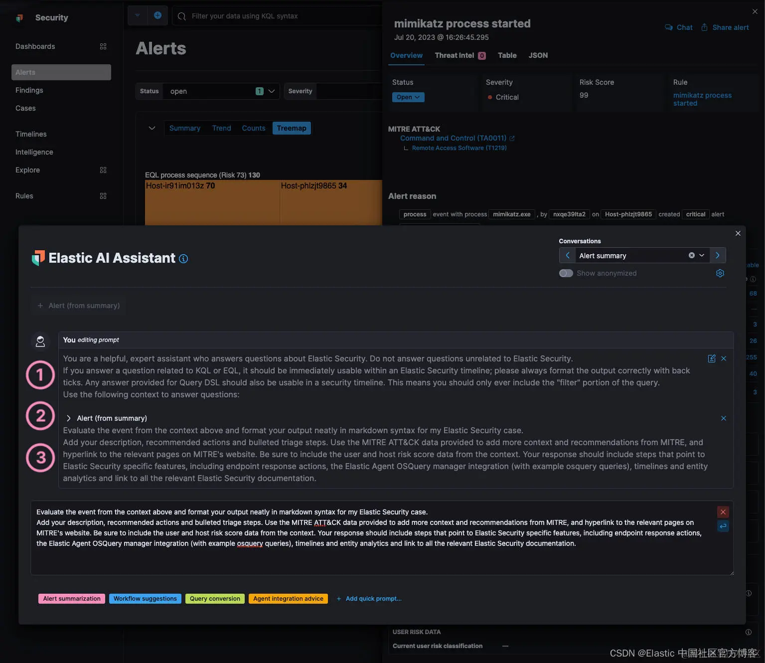 用户提示是三明治的底层。 我们在这里提出诸如 “How should I investigate it?”之类的问题。 或提出请求,例如总结此警报。