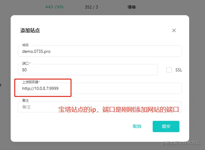 这里说一下,雷池中的上游服务器是指 建站的服务器ip,因我用来腾讯云内网互联,所以填的ip是10.0.8.7,ip后面的端口就是刚刚宝塔添加的网站端口,防火墙域名下面的端口如果不加ssl就填80,加ssl就填443。