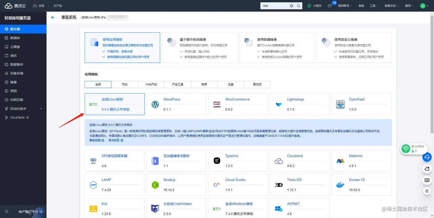 我们这里用的腾讯云轻量应用服务器,这里我已经安装了镜像为了写教程重新安装一遍。