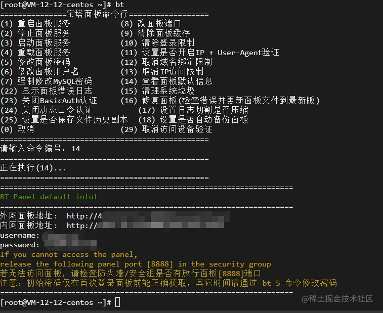 在输出14 查看面板默认信息,控制台会打出当前宝塔面板的地址和账号密码
