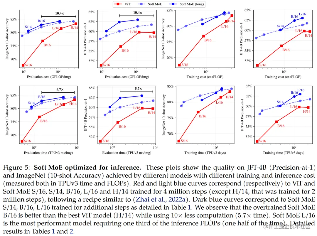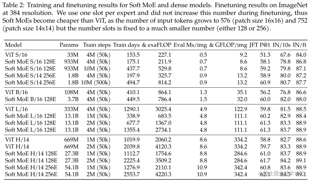 即使将 ViT-H/14 的训练预算加倍(2M step 和 2039.8 train days),Soft MoE B/16(1011.4 days)也几乎与它性能相近。
