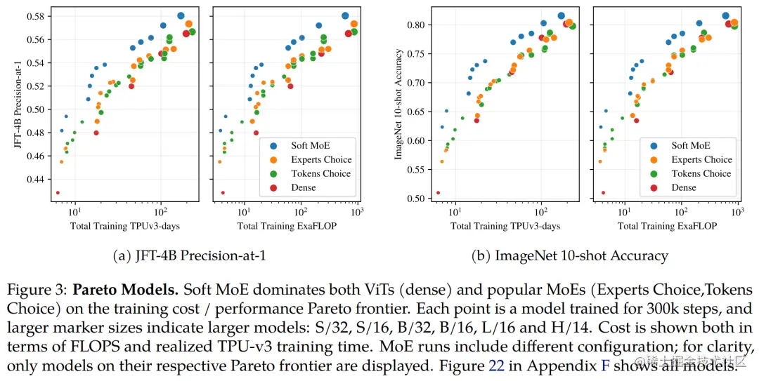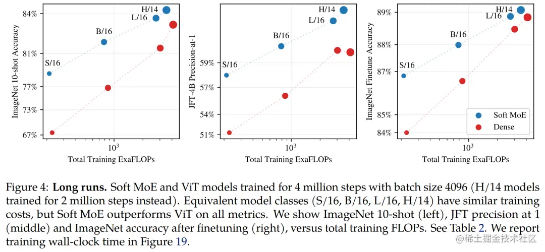 下图 3a 和 3b 显示了每个类别中模型的结果,这些模型位于各自的训练成本 / 性能帕累托边界上。在上述两个评估指标上,对于任何给定的 FLOP 或时间预算,Soft MoE 显著优于密集和其他稀疏方法。