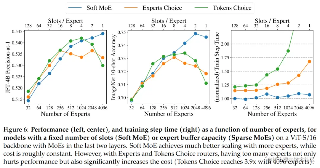 此外,硬路由(hard routing)在专家模块数量较多时可能具有挑战性,因此大多数研究的训练只有几十个专家模块。相比之下,Soft MoE 可扩展至数千个专家模块,并且可以通过构建实现平衡。最后,Soft MoE 在推理时不存在批次效应(batch-effect)。