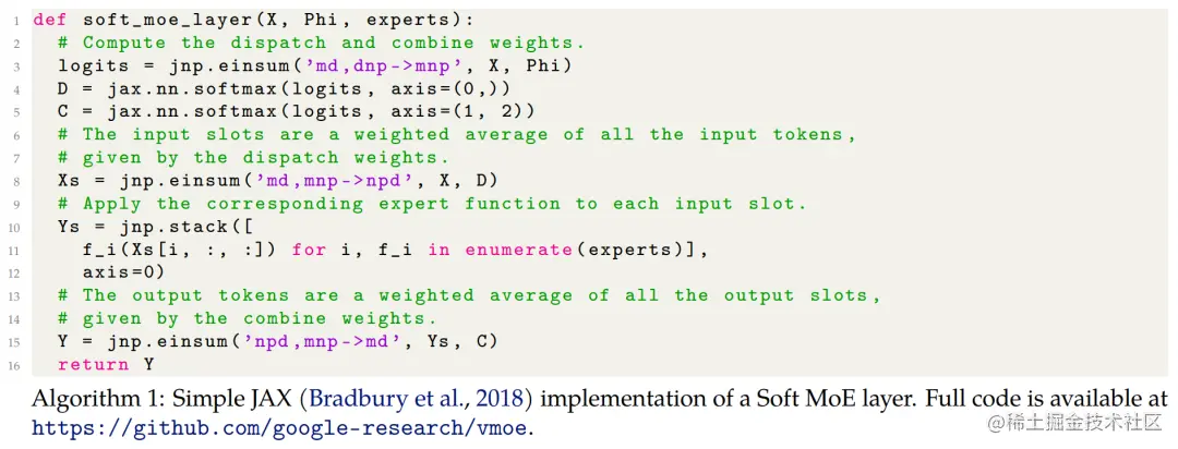 Soft MoE 路由算法如下图 2 所示。研究者使用 X ∈ R^m×d 来表示一个序列的输入 token,其中 m 是 token 数量,d 是维数。每个 MoE 层使用一组 n 个专家函数应用于单个 token,即 {f_i : R^d → R^d}_1:n。每个专家将处理 p 个 slot,每个 slot 有相应的 d 维参数向量。他们用